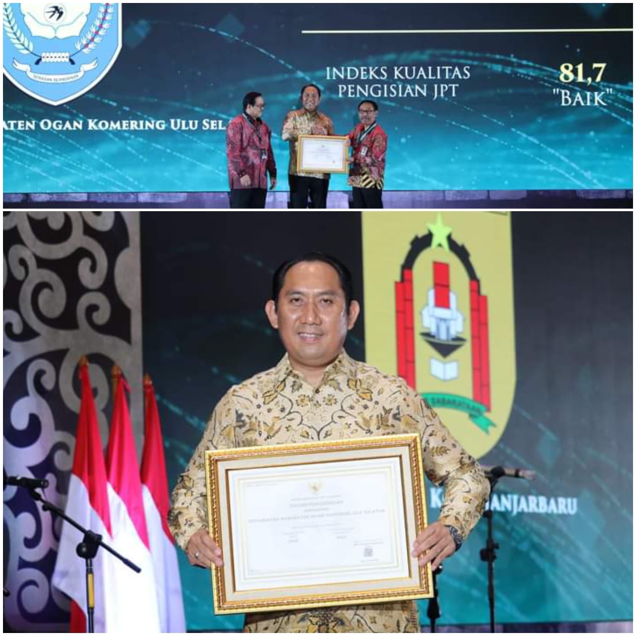Penghargaan tersebut diterima langsung oleh, Bupati Ogan Komering Ulu Selatan, Popo Ali Martopo, B.Comm., dengan dua kategori penghargaan yang diterima yaitu, Nilai Sistem Merit dengan Predikat Baik, dan Indeks Kualitas Pengisian JPT dengan Predikat Baik.
