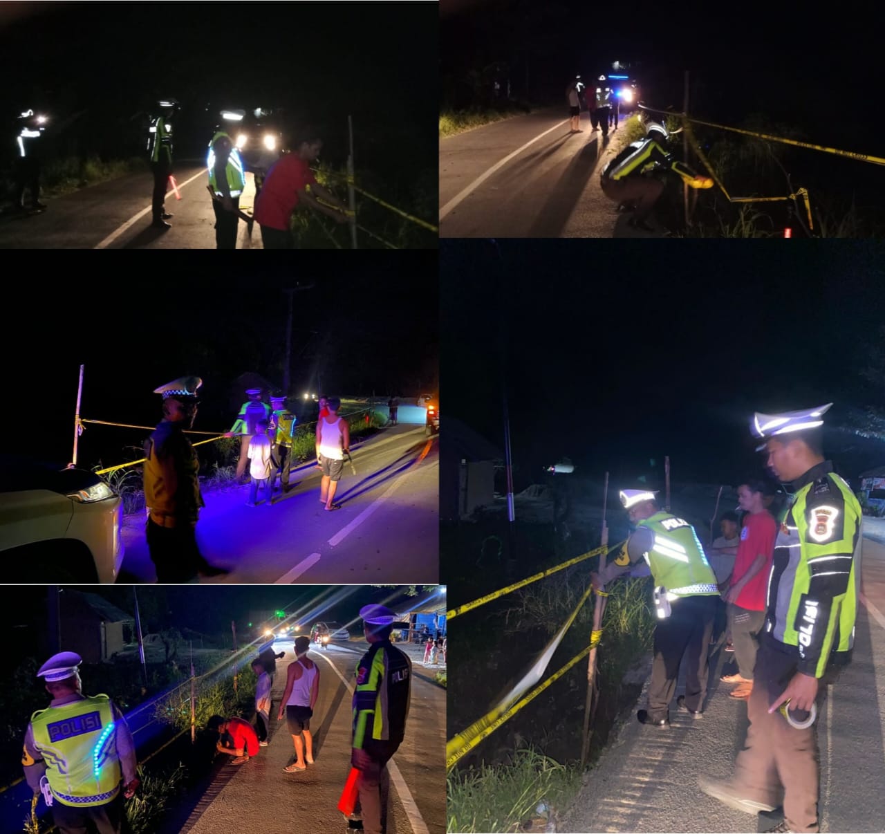 Mereka memasang Polisi line pada lokasi tersebut, agar pengguna jalan roda dua maupun empat dapat melihat jalur tersebut dengan jelas dan hati-hati saat melewati. Pada Minggu malam 28 April 2024.
