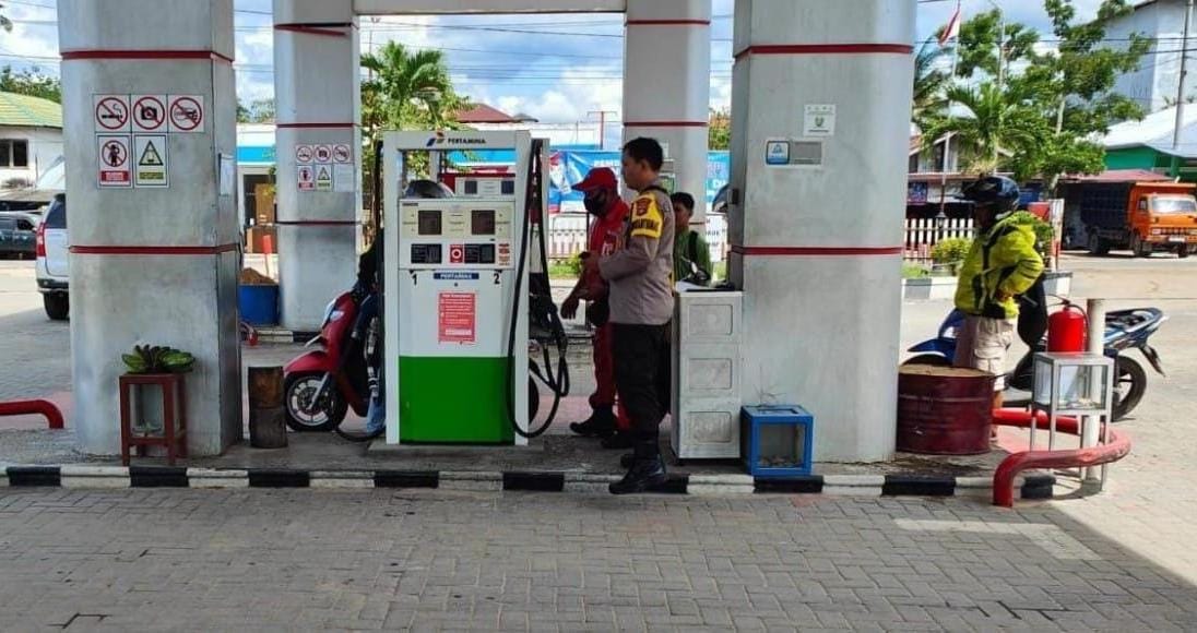 Anggota Polsek Jaya Karya Laksanakan Penertiban Dan Pengawasan Terhadap Kendaraan R2/R4/R6 Yang Akan Melakukan Pengisian BBM Besubsidi di SPBU 64.743.04 Samuda