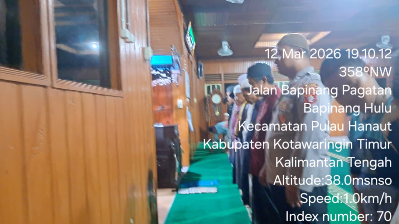 Pulau Hanaut ~ Personel Polsek Pulau Hanaut melaksanakan pengamanan (Pam) saat pelaksanaan Sholat Isya dan Tarawih berjamaah di Masjid Al Mukhtar Desa Bapinang Hulu Kec.Pulau Hanaut Kab.Kotim Prov.Kalteng,Kamis (12/3/2026) Malam.