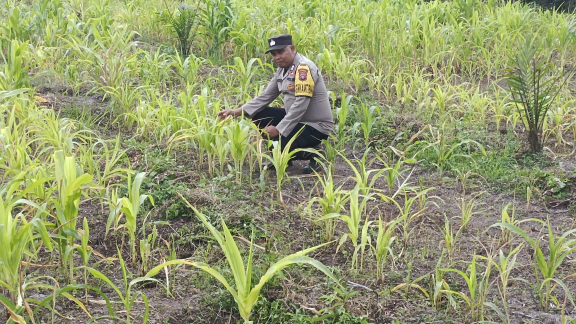 Bhabinkamtibmas melakukan pengecekan tersebut memastikan pertumbuhan tanaman jagung memastikan dalam keadaan bagus dan tidak ada gangguan dari hama maupun binatang lain perusak tanaman.