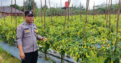 Berlokasi lahan milik warga Desa Tanah Putih Kecamatan Telawang Bripka Riyono  kunjungi petani yang melakukan pembudidayaan tanaman cabai sebagai komitmen Polri dalam mendukung Asta Cita menuju Indonesia Emas 2045, dengan fokus khusus pada ketahanan pangan sebagai pilar utama.