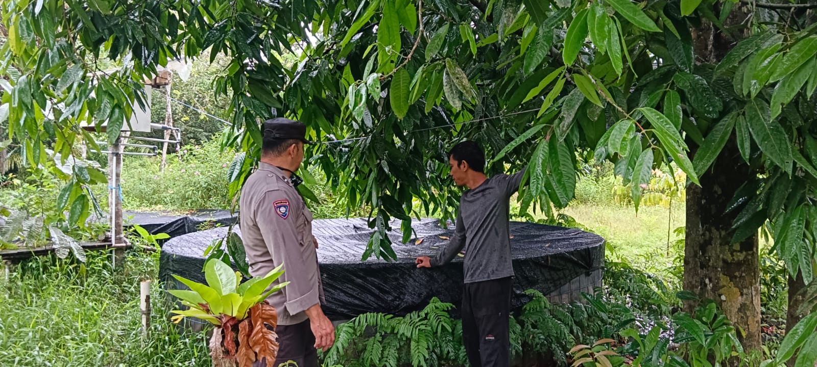 Bhabinkamtibmas Aipda Muhammad Riski Setiawan melakukan pengecekan lahan untuk memastikan pertumbuhan dan kebutuhan perikanan milik warga, Lahan ini menjadi bukti nyata upaya masyarakat dengan dukungan Bhabinkamtibmas Polsek Ketapang dalam mengelola sumber daya yang ada untuk memajukan pangan lokal.