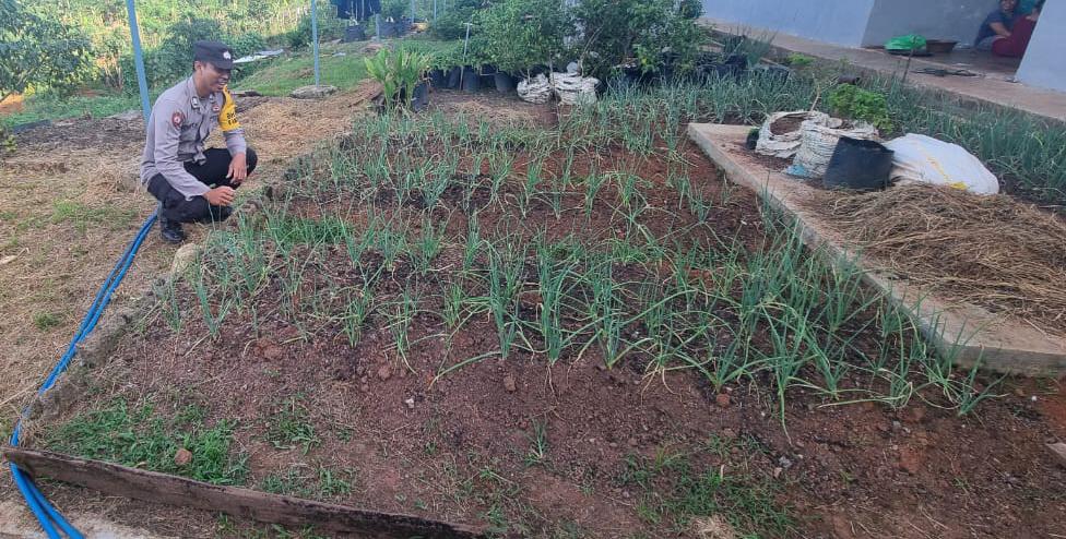 Kapolsek Baamang, IPTU Dr.Helmi Hamdani, S.K.M.,S.H.,M.M.,M.H.,CCPA.,CATA, bersama Bhabinkamtibmas Bripka memet kussunarta melakukan pengecekan terhadap pekarangan pangan milik warga bernama Sdr. Jali yang memanfaatkan lahan sekitar rumahnya untuk membudidayakan tanaman daun bawang.