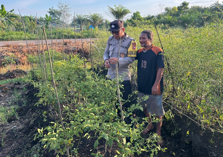 Bhabinkamtibmas Aipda Yudi Supriadi melakukan pengecekan lahan di pekarangan waega binaannya, Lahan ini menjadi bukti nyata upaya masyarakat dengan dukungan Bhabinkamtibmas Polsek Ketapang dalam mengelola sumber daya yang ada untuk memajukan ketahanan pangan lokal.
