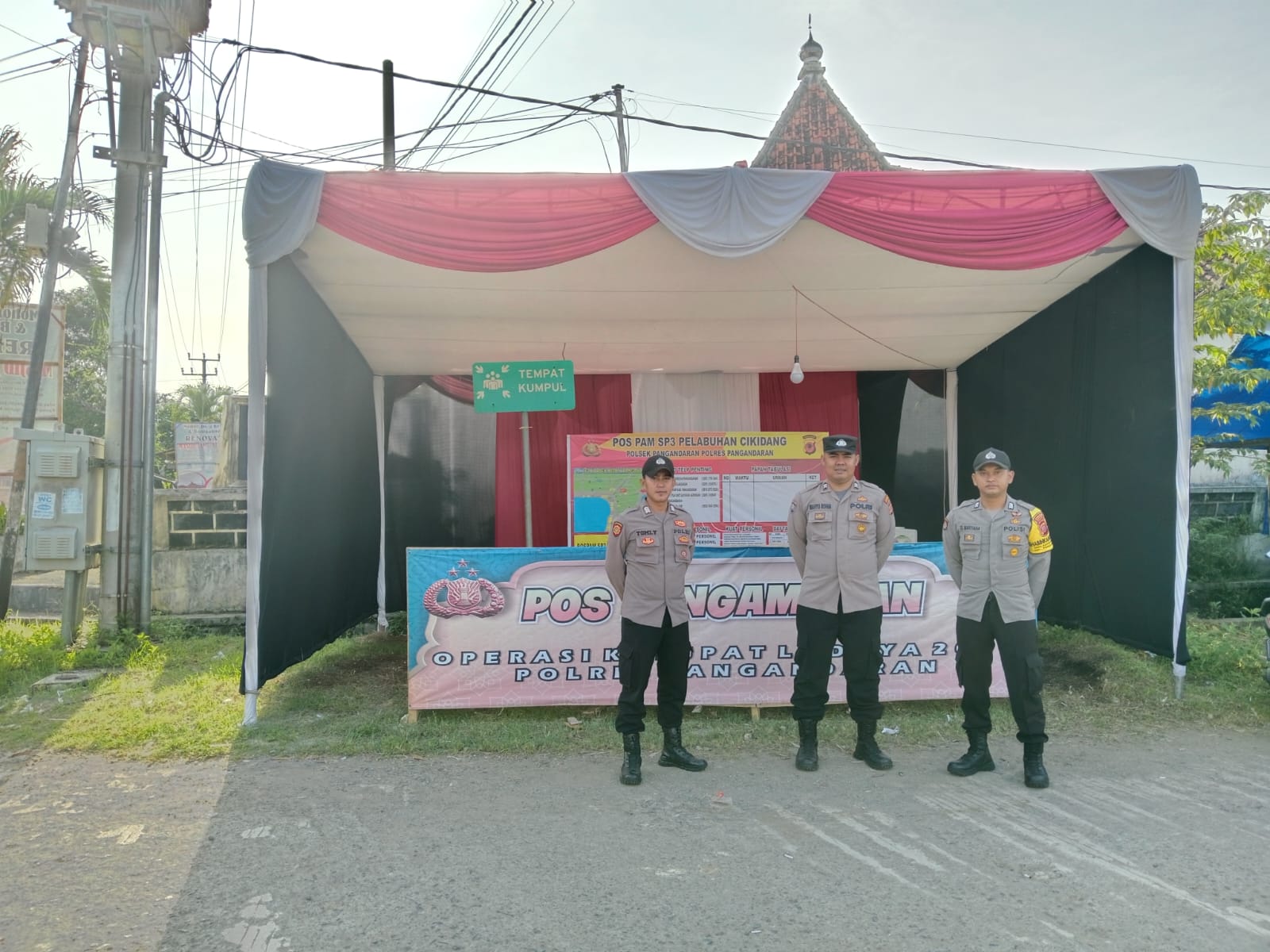 0PANGANDARAN, Polda Jabar – POLSEK PANGANDARAN, Bhabinkamtibmas Desa Pangandaran Bripka Dian Mardiana. Melaksanakan Pos Pam Di Simpang Tiga Pelabuhan dalam Rangka Ops ketupat lodaya 2023.(Rabu 26/04/2023)