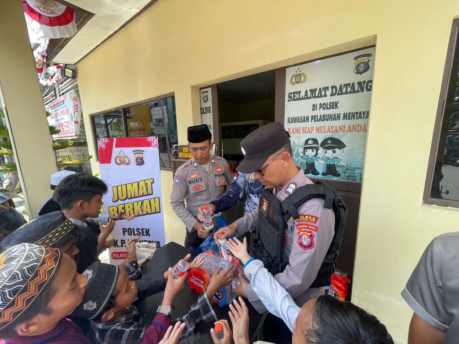 Kotim – Polsek KP. Mentaya Polres Kotawaringin Timur bagikan makanan dan minuman kepada masyarakat sekitar Polsek Kawasan Pelabuhan Mentaya dan Jamaah Masjid yang selesai melaksanakan Shalat Jumat Jumat(1/11/2024) siang.