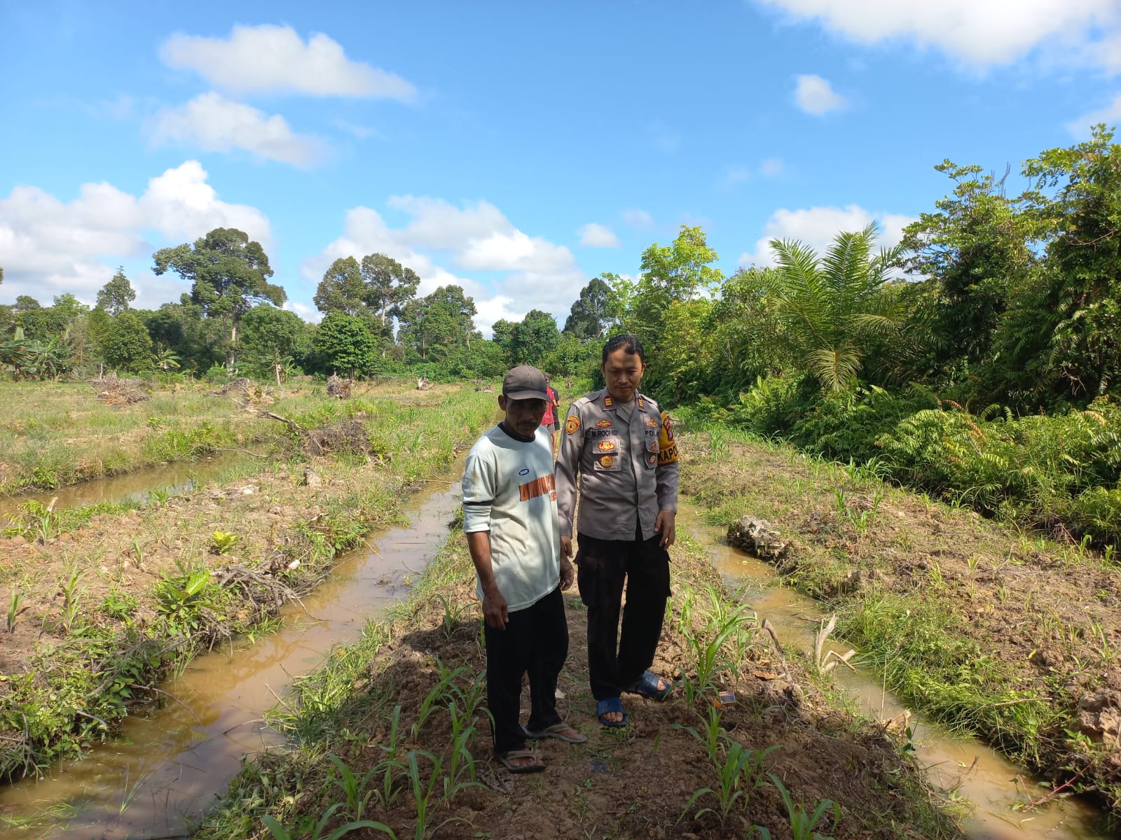 Kotim – Kapolsek Cempaga Polres Kotim (Kotawaringin Timur) Jajaran Polda Kalteng AKP Moh. Rochim, S.Sos cek pertumbuhan tanaman jagung di lahan milik Kelompok Tani Durian Berkah yang merupakan Mitra Polsek Cempaga Desa Cempaka Mulia Barat Kec. Cempaga Kab. Kotim Prov. Kalteng, Jumat (13/6/2025) pagi.