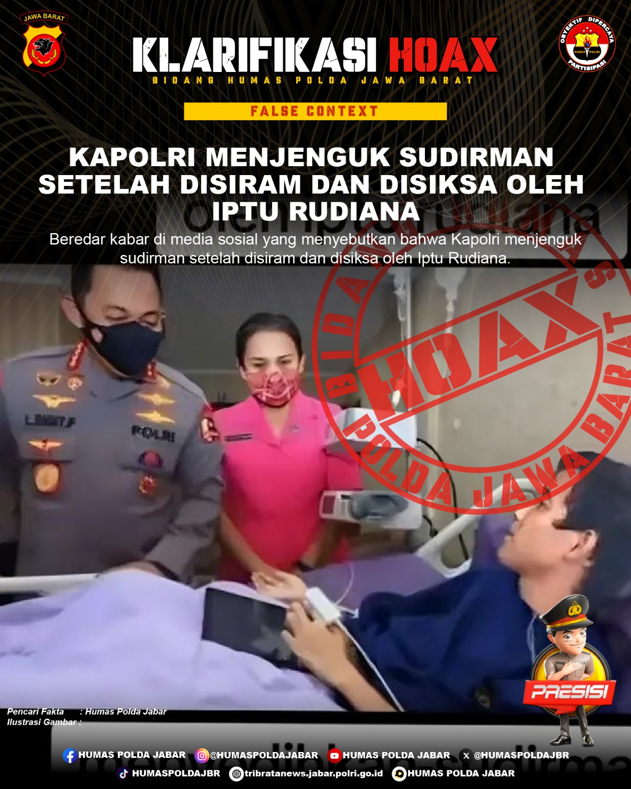 Jakarta–Beredar kabar di media sosial yang menyebutkan bahwa kapolri menjenguk sudirman setelah disiram dan disiksa oleh iptu Rudiana. Kabar tersebut adalah HOAKS dan tidak benar.