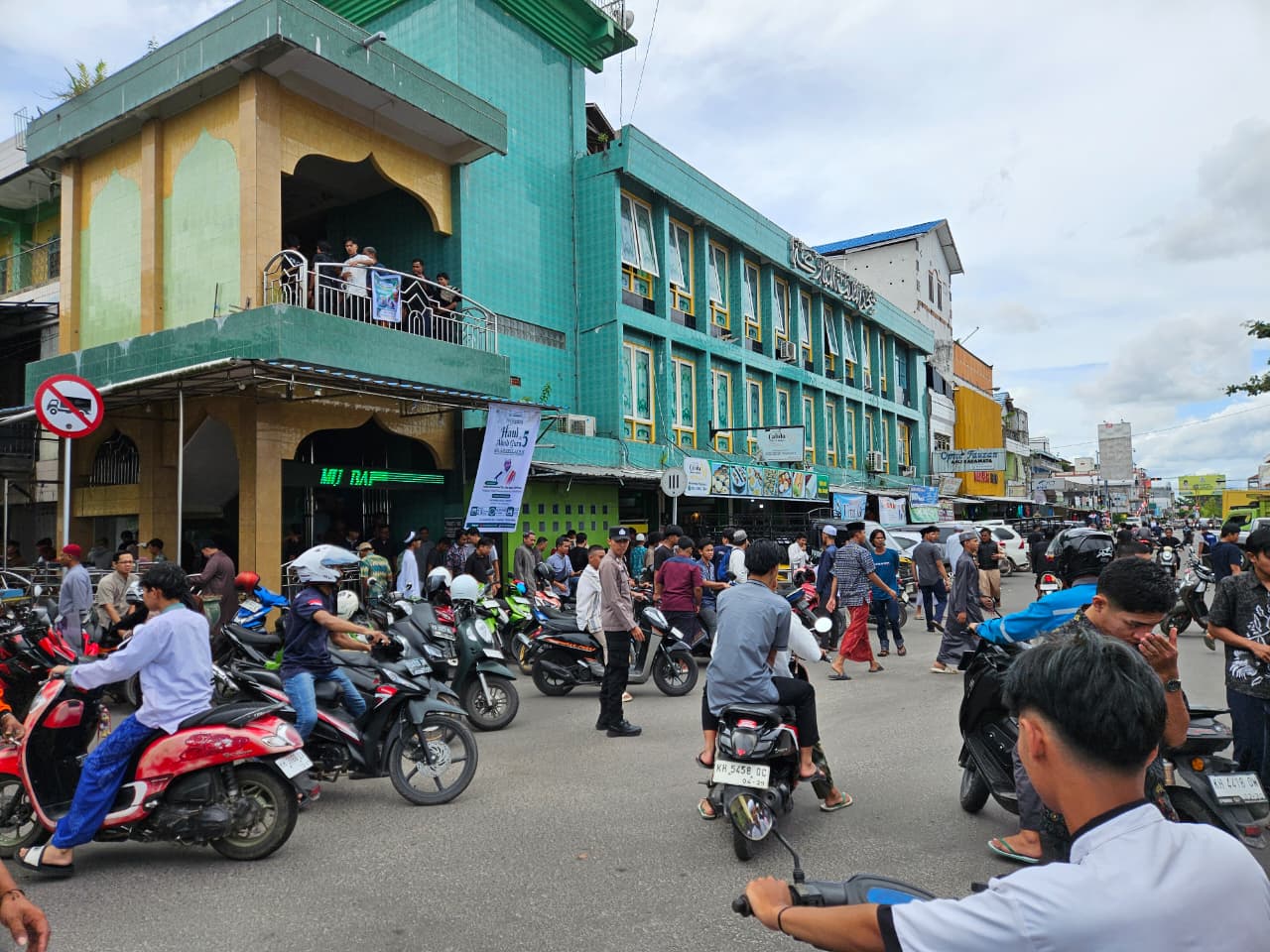 Anggota Polsek KP Mentaya ditempatkan di beberapa titik strategis di sekitar area masjid untuk memastikan kelancaran arus kendaraan dan keamanan jemaah yang menyeberang jalan.