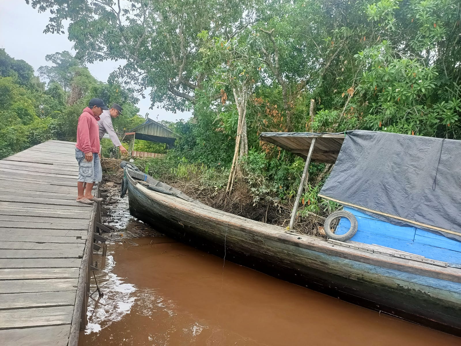 Pulau Hanaut ~ Menghadapi cuaca yang tidak menentu dan terjadinya hujan lebat yang turun , Polsek Pulau Hanaut melakukan patroli wilayah serta cek debit air Sungai Mentaya di Desa Rawa Sari Kec.Pulau Hanaut Kab.Kotim, Rabu(28/1/2026) Siang.