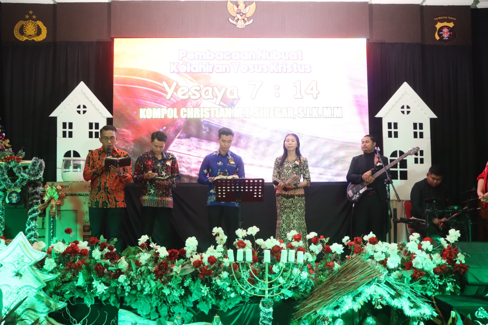 Ibadah Perayaan Natal dipimpin oleh Pendeta Nike Anggraeny S.th , Pdt Satiani S Dana M Th. (GKE), Pdt Naftali Tinambunan (G Hermon ) Pdt Dr Subur Budiono M.Th., (G Filadelfia) Fastur Yohanes Dediyanto Bagus .Msf. (Katolik) dan Pdt Daniel Artius.M.ms. (G HGC) , dengan mengusung tema “Allah Hadir Untuk Menyelamatkan Keluarga” Sub Thema ” Suka Cita kelahiran Yesus Kristus Memotivasi Polri dalam melayani masyarakat untuk Indonesia maju” dan diikuti sekitar 250 jemaat. Selama pelaksanaan ibadah yang berlangsung sejak pukul 17.30 WIB selesai Ibadah dilanjutkan perayaan Natal. selesai skj 21.30 Wib.