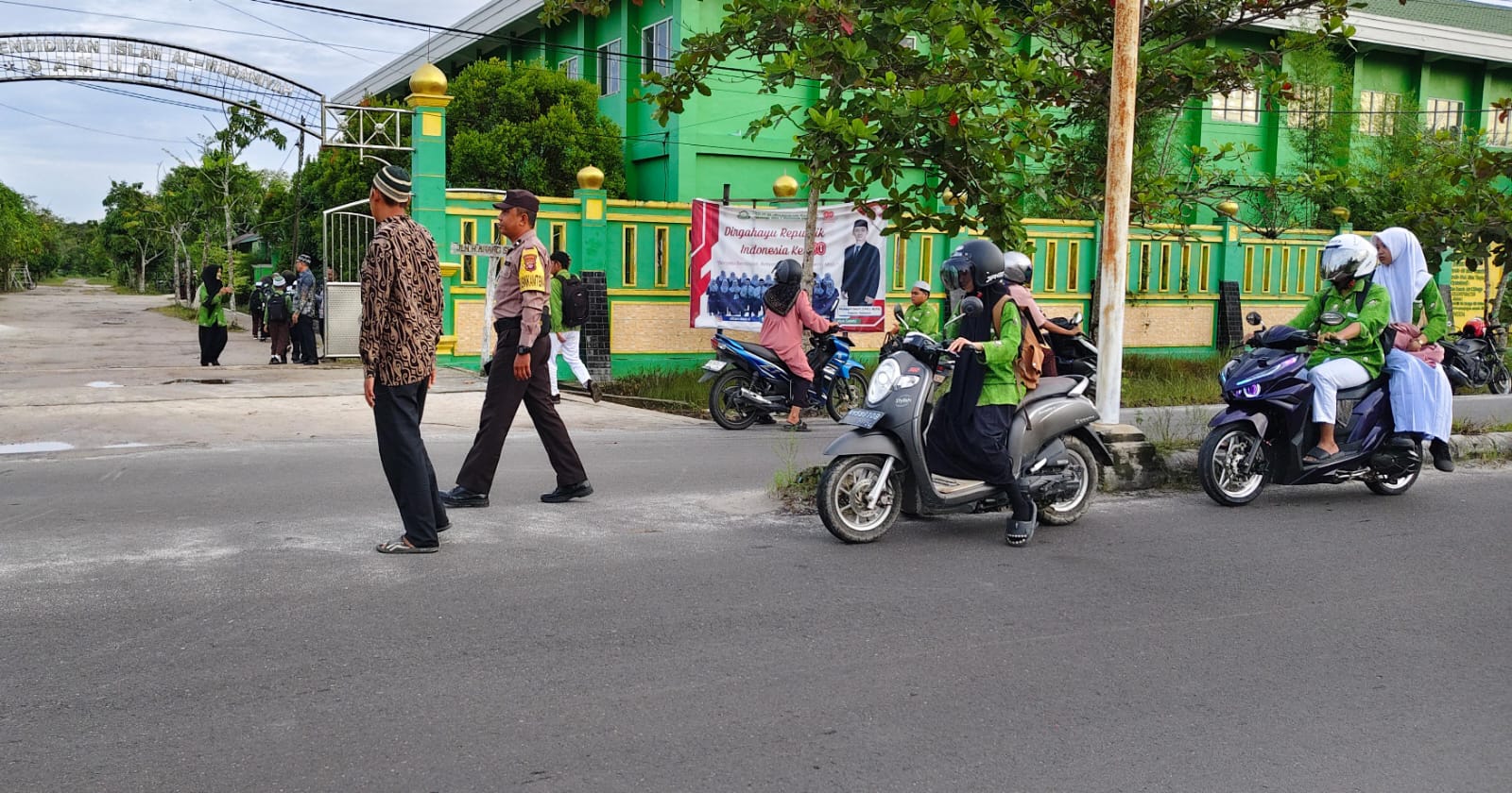 Personel Polsek Jaya Karya melaksanakan Gatur pagi saat anak masuk sekolah disamuda.