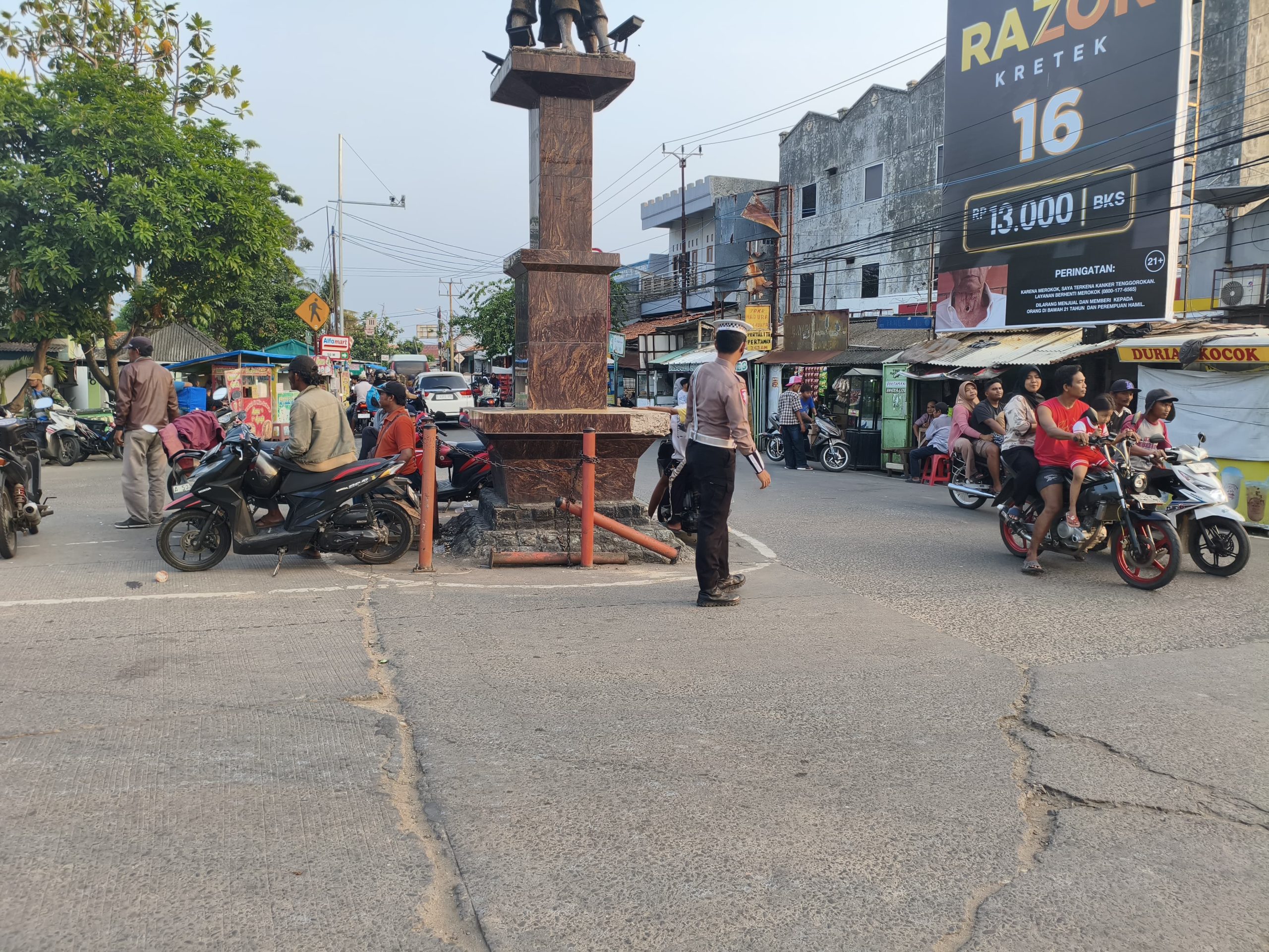 MAUK – Anggota Lantas Polsek Mauk Polresta Tangerang Polda Banten Bripda Ilham melakukan pengaturan arus lalu lintas pada Pagi hari di perempatan Tugu Mauk.