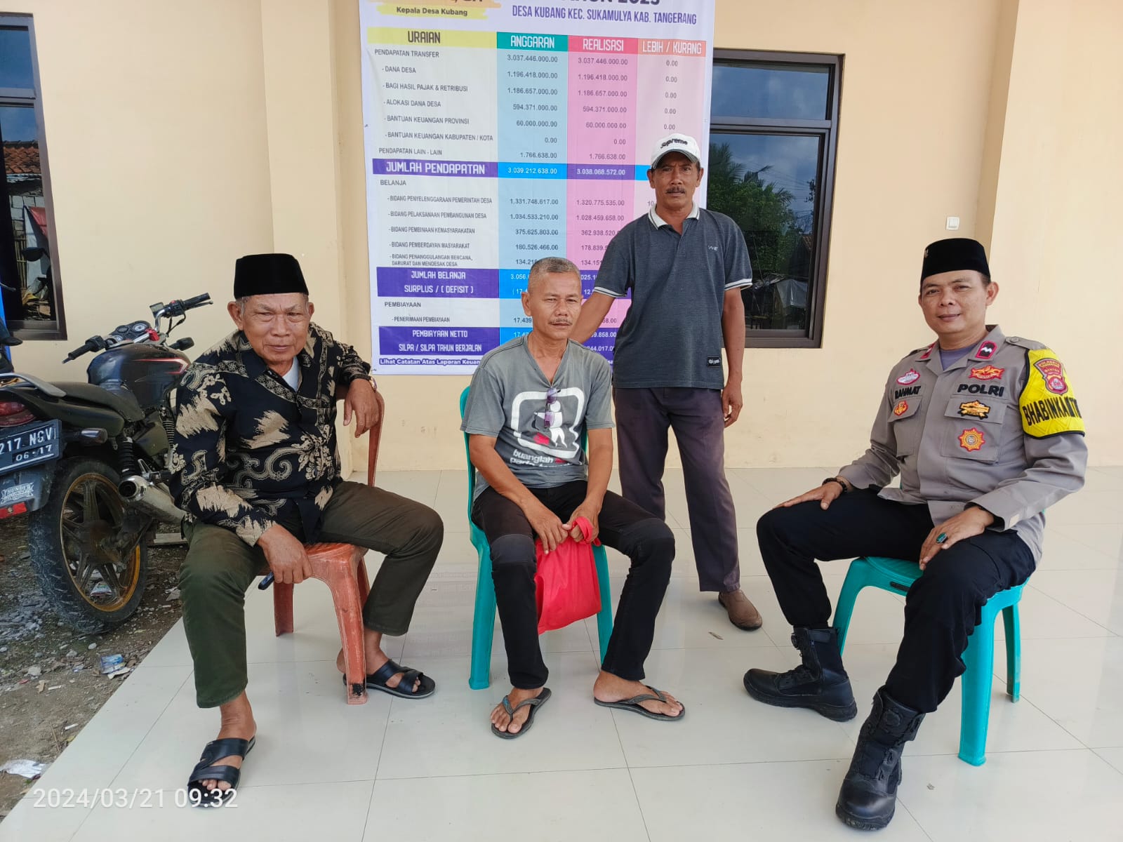 Tangerang– Bhabinkamtibmas Desa Kubang Polsek Balaraja Polresta Tangerang, Aipda Rahmat Kerap Mengunjungi Warga Binaan Desa Kubang Sekaligus menyampaikan pesan Kamtibmas agar selalu menjaga lingkungannya tersebut dari orang-orang yang tidak bertanggung jawab, bersilaturahim dengan Tokoh Masyarajat di Desa Kubang Kecamatan Sukamulya Kabupaten Tangerang.” Kubang(21/03/2024)