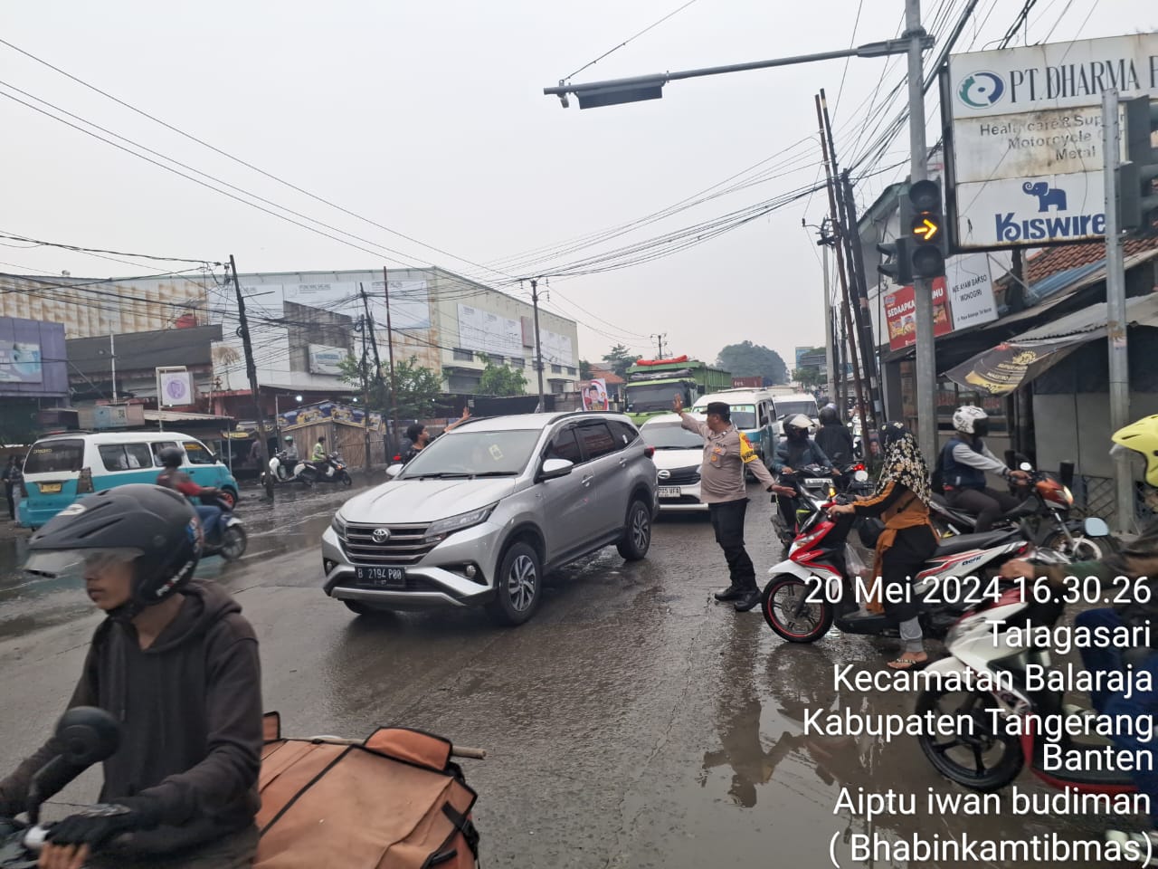 Tangerang//Balaraja Bhabinkamtibmas Kel.Balaraja Aiptu Iwan Budiman bersama Bripka Peter Gaol Protap Sore di Pertigaan PT Adis Balaraja melaksanakan kegiatan strong Point sore hari tetap melayani masyarakat yakni pengaturan lalu lintas sore hari ini di Darkum Polsek Balaraja serta memberikan himbauan kepada pengguna jalan Balaraja ,” Senin (20/05/2024)”.