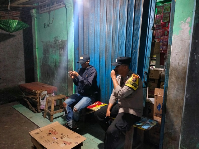Bhabinkamtibmas Polsek Ciomas Polresta Serkot Brigpol Asep dan Briptu Feri patroli malam,sambangi warga sampaikan pesan kamtibmas.