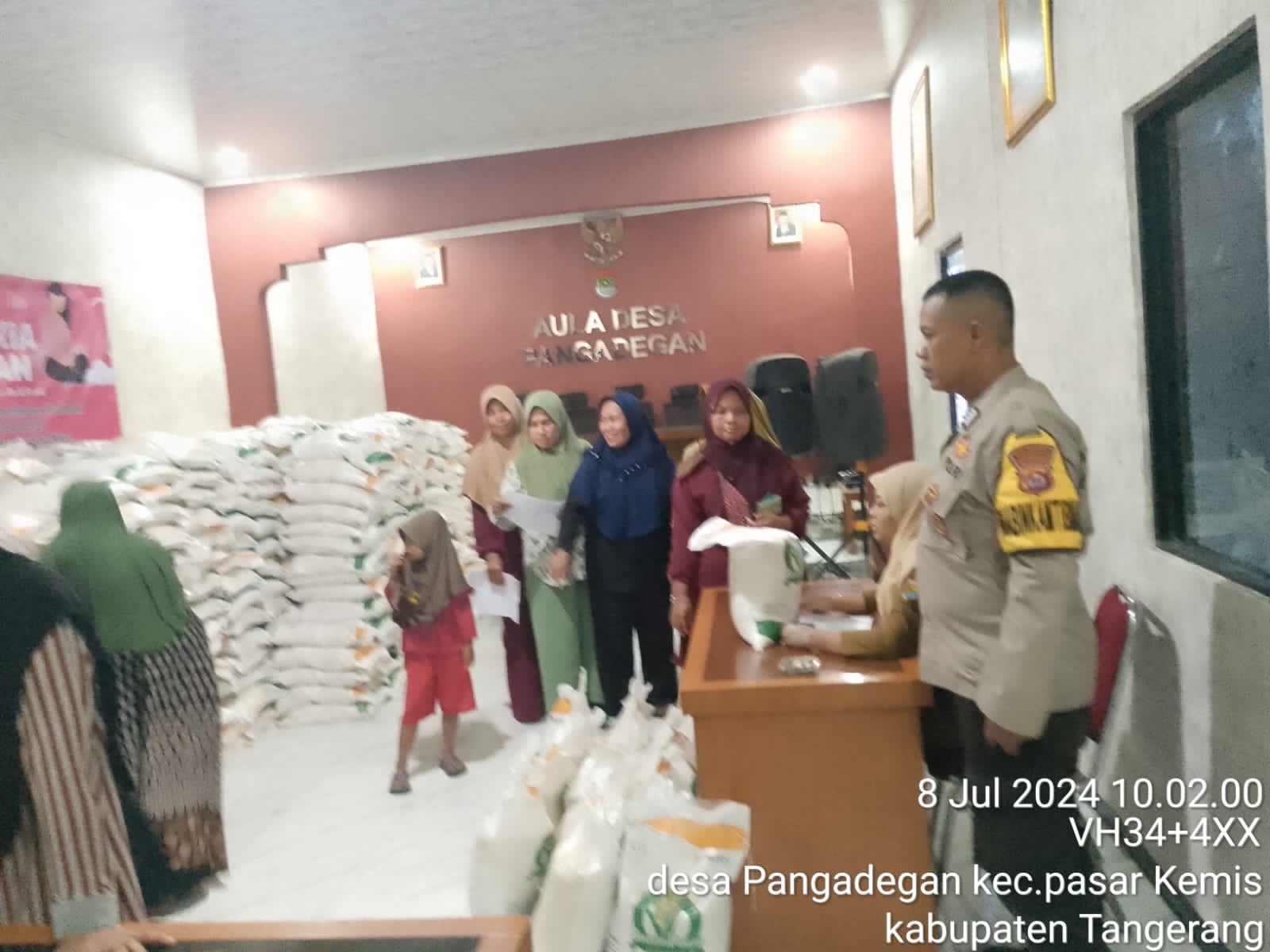 Tangerang – Bhabinkamtibmas Polsek Pasar Kemis Polresta Tangerang Polda Banten Bripka Kahar Mujiono Melaksanakan monitoring penyaluran beras bantuan pangan Thn 2024 untuk Alokasi Bulan Juli 2024 untuk masyarakat Desa Pangadegan dari Kantor Bulog sebanyak 10 kg beras / KPM di Kantor Desa Pangadegan Kecamatan Pasar Kemis Kab. Tangerang, Senin (08/07/2024)