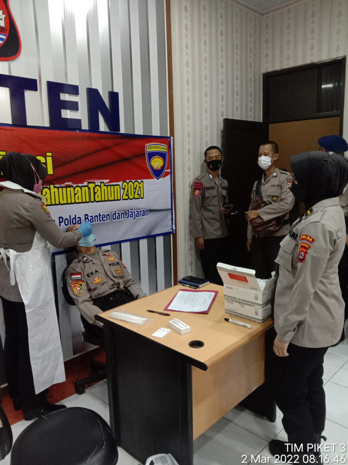 Pemeriksaan swab antigen dilaksanakan oleh tim piket Biddokkes Polda Banten dan untuk pemeriksaan dilakukan sebanyak 30 personel Polda Banten.