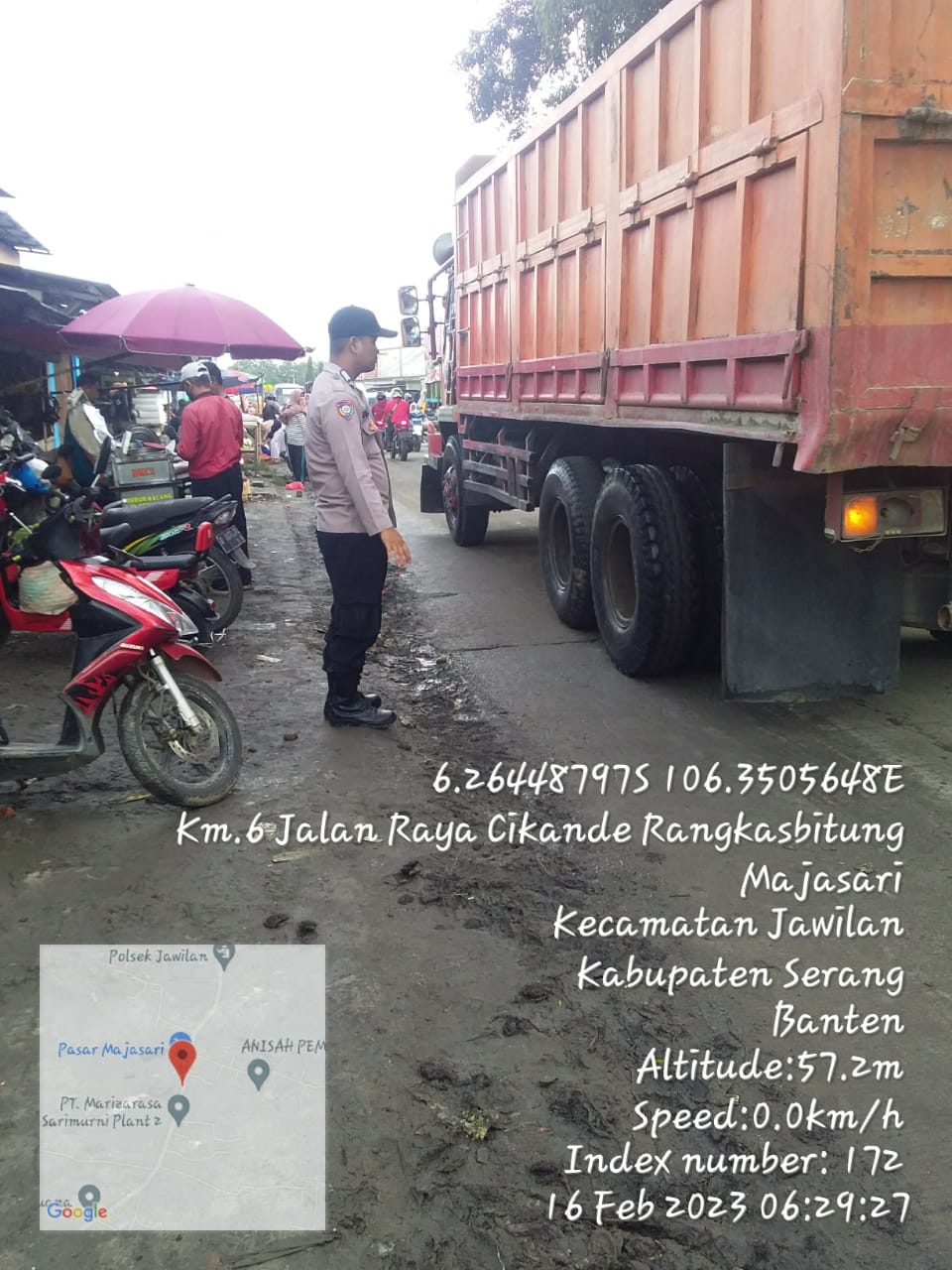 Baraknews Polres SERANG –Bhabinkamtibmas Polsek Jawilan Bripka Jaenal dan Briptu Hartanto melaksanakan giat strong poin pagi di pasar Majasari Kecamatan Jawilan, (16/2/2023)