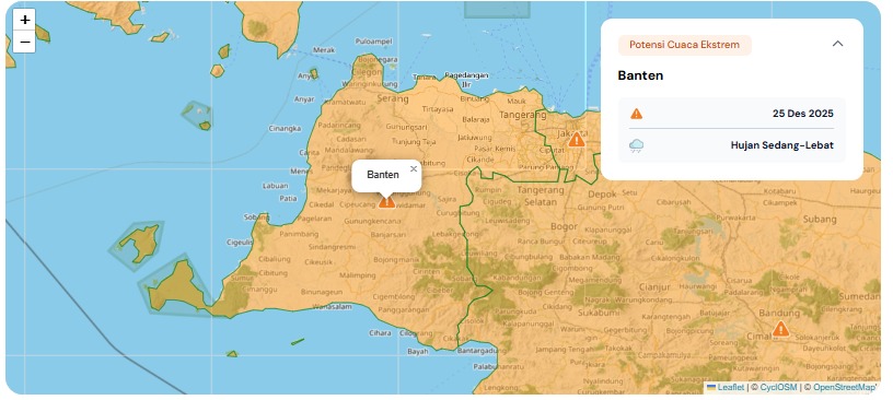 BMKG juga mengeluarkan peringatan dini agar mewaspadai potensi hujan sedang hingga lebat yang dapat disertai kilat/petir dan angin kencang di wilayah Kabupaten Pandeglang bagian Utara, Kabupaten Lebak bagian Timur, Kabupaten Tangerang bagian Selatan, serta Kota Tangerang Selatan.