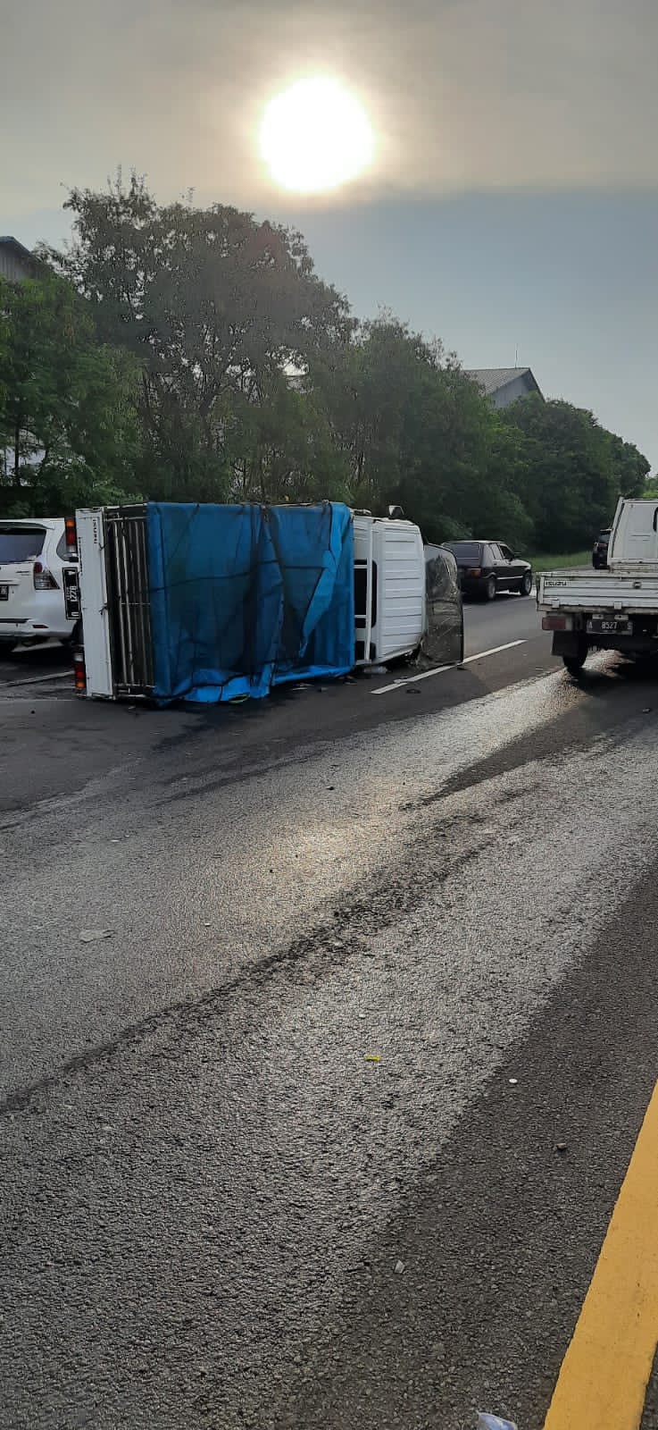 Sebuah kendaraan Pick Up nopol A-8221-U supir AL (43) diduga mengalami kempes ban yang kemudian mengakibatkan kendaraan tersebut terbalik. “Benar, telah terjadi laka tunggal kendaraan Pick Up bermuatan ikan lele di jalur tol Km 72.700 A,”kata Dirlantas Polda Banten Kombes Pol Budi Mulyanto.