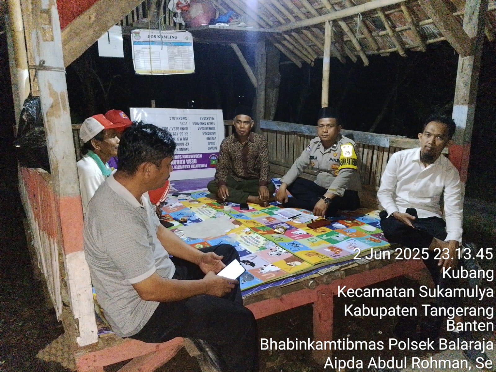 Iptu Mahdi SH Pawas Polsek Balaraja dan Aipda Aipda A. Rohman SE serta Aipda Eka Cristian Anggota Polsek Balaraja Melaksanakan Sambang dan Silaturahmi di Desa Kubang ini sebagai upaya mendekatkan diri kepada masyarakat dan juga memberikan pesan-pesan kamtibmas, diantaranya menghimbau kepada Warga Binaan agar senantiasa meningkatkan kewaspadaan. guna mencegah kejahatan tindak Pidana, kriminal seperti Aksi Premanisme, Curanmor, Begal, dan Tawuran beserta yang mengganggu keamanan dan ketertiban masyarakat di Wilayah Hukum Polsek Balaraja Polresta Tangerang.