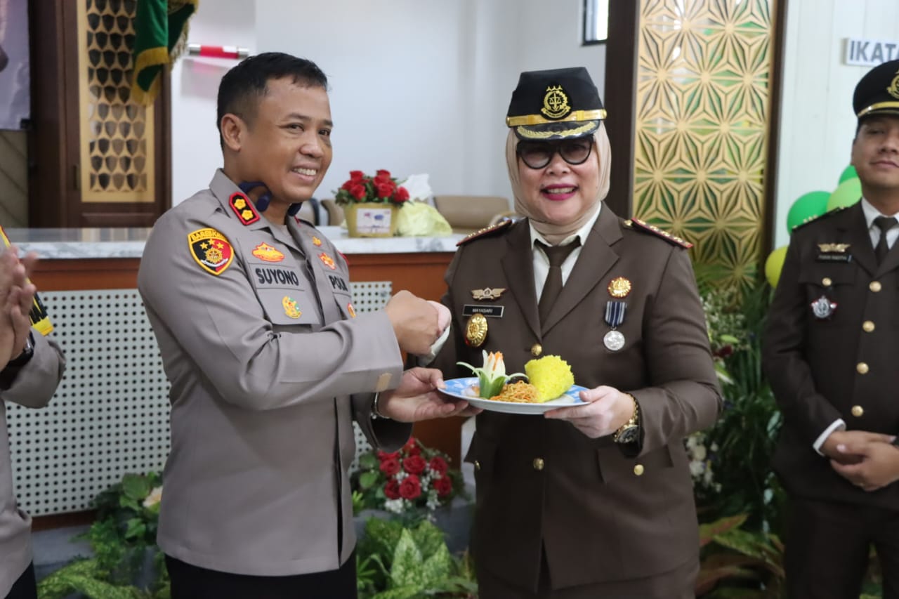 Lebak—. Di Hari Bhakti Adhiyaksa ke-64, Kapolres Lebak Polda Banten AKBP Suyono, SIK memberikan Kejutan Tumpeng ke Kajari Lebak Mayasari SH. MH di Kantor Kejaksaan Negeri Lebak Jl. M.H. Iko Jatmiko No 3 Rangkasbitung, Kabupaten Lebak. Senin (22/7/2024).