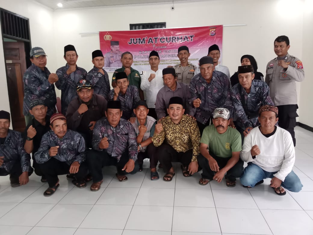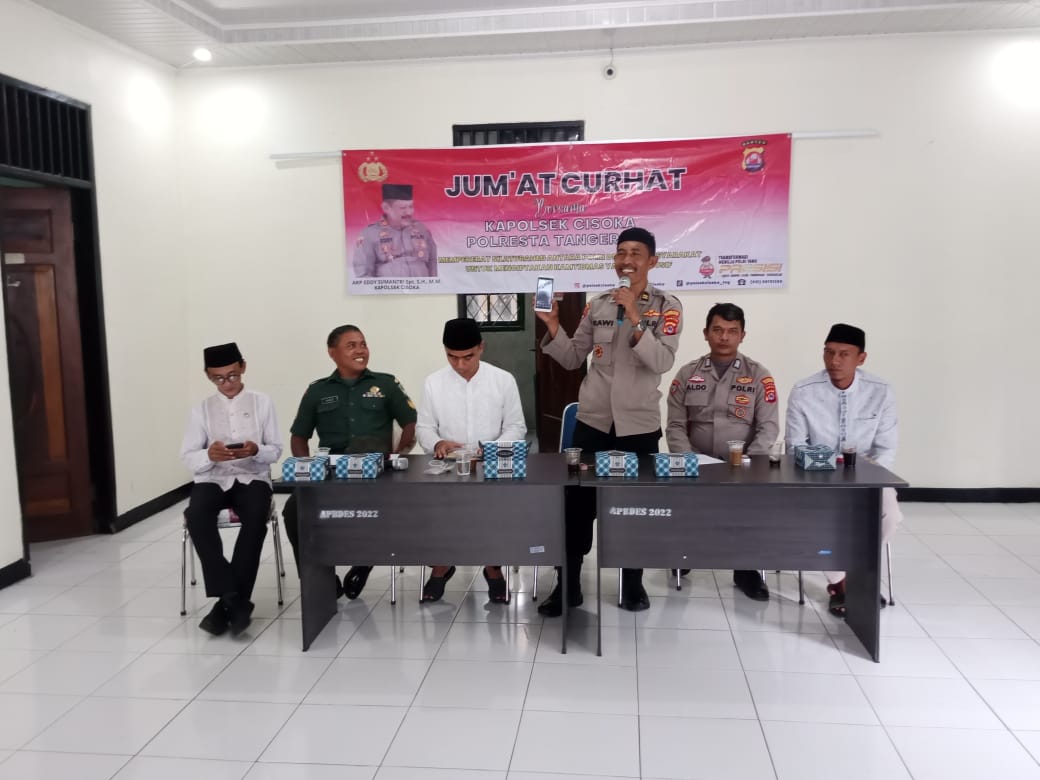 Baraknews Cisoka, Kabupaten Tangerang, Polsek Cisoka Polrsta Tangerang giat Jum’at Curhat bersama Kapolsek Cisoka AKP Eddy Sumantri, Spt, SH. MM, yang diwakili Iptu Rawi (kanit binmas) dikantor Aula Desa Dangdeur Kecamatan Jayanti Kabupaten Tangerang Jumat 17/02/2023