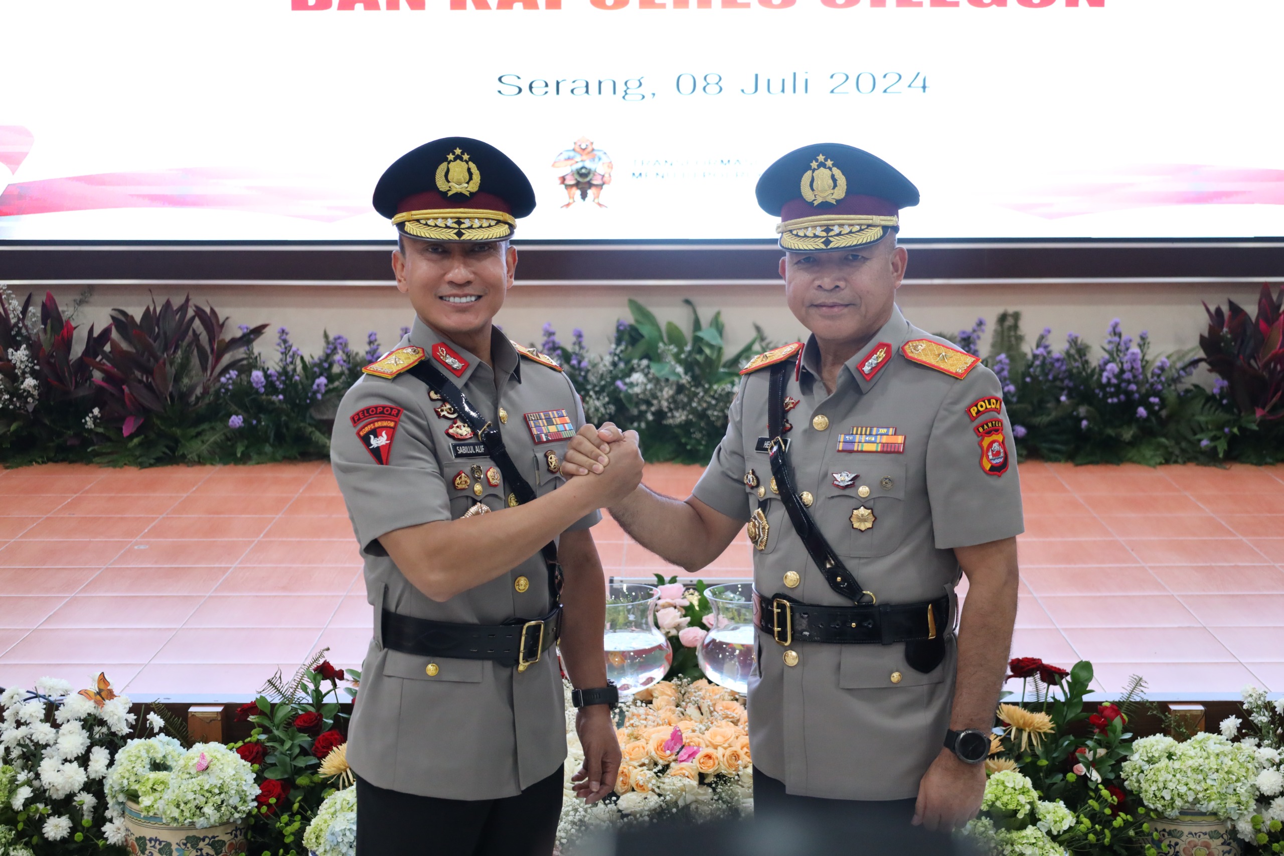 Serang – Kapolda Banten Irjen Pol Abdul Karim memimpin prosesi serah terima jabatan (sertijab) Wakapolda Banten, Karorena Polda Banten, Kabiddokkes Polda Banten dan Kapolres Cilegon bertempat di Aula Sebaguna Polda Banten pada Senin (08/07).