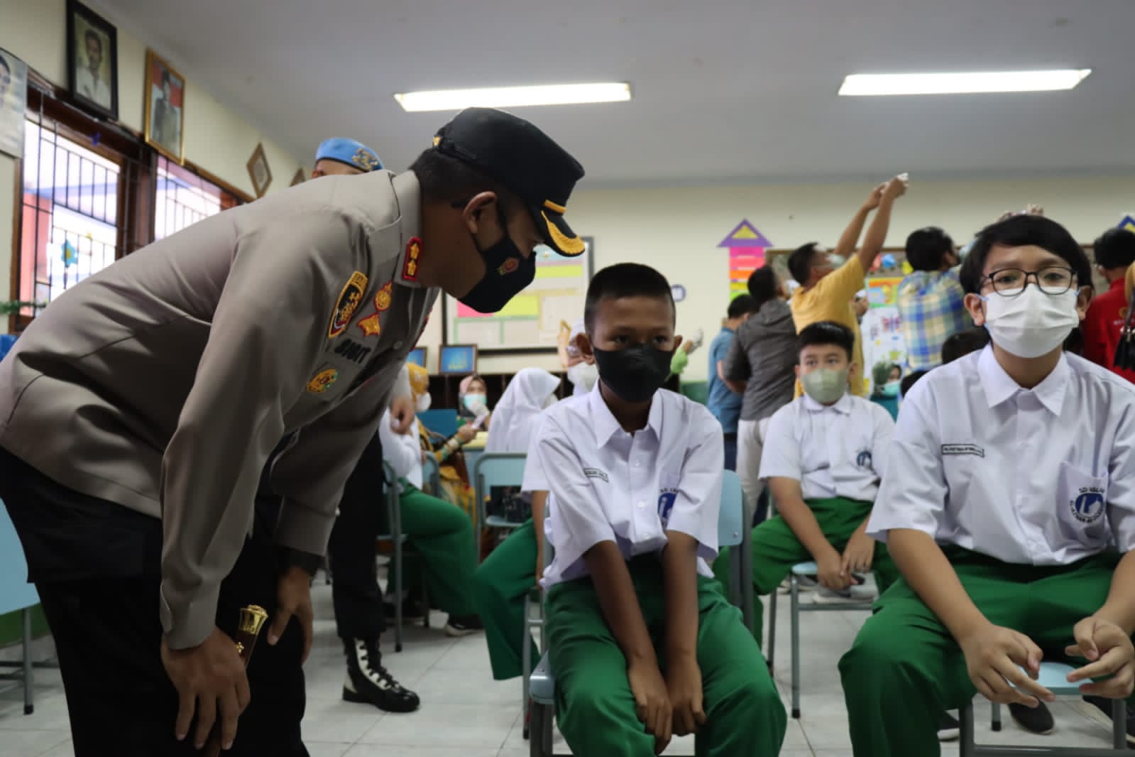 Baraknews Cilegon–, Kapolres Cilegon Polda Banten AKBP Sigit Haryono menyapa pelajar sekolah dasar yang mengikuti kegiatan vaksinasi pelajar yang dilaksanakan oleh Badan intelijen Negara daerah provinsi Banten yang dilaksanakan di SD Islam Al Azhar 41 Cilegon, Selasa, (22/2).
