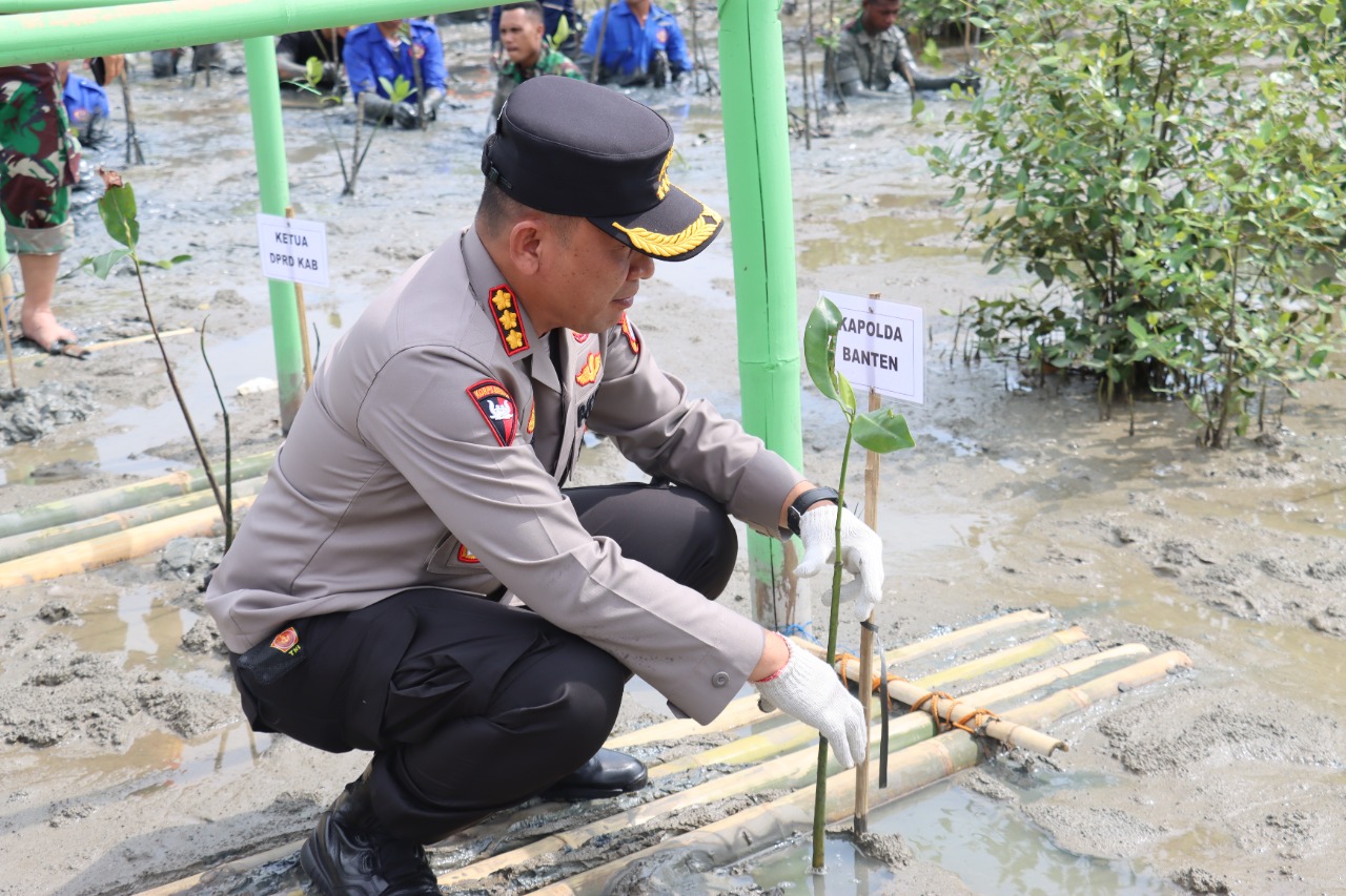 Baraknews POLRESTA SERKOT_ Kapolresta Serkot Kombes Pol Nugroho Arianto, hadiri kegiatan penanaman pohon mangrove di kawasan Politeknik Ahli usaha perikanan Kota Serang, dalam rangkaian kegiatan kunjungan Danrem 064/Maulana Yusuf Brogjen TNI Yuniato, Senin (13/06).