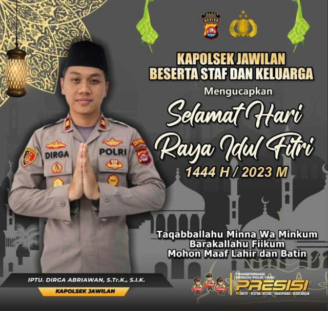 “Kepala Kepolisian Sektor Jawilan Beserta Staf dan Bhayangkari mengucapkan Selamat Harj Raya Idul Fitri 1 Syawal 1444 Hijriyah. Taqabbalahu Minna Wa Minkum Taqabal Ya Karim, Mohon Maaf Lahir Dan Batin,” ucap Kapolsek.