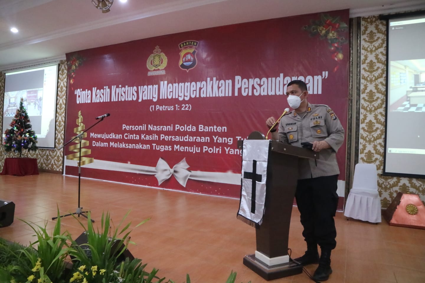 Ibadah Natal dipimpin oleh Pendeta Joseph Butarbutar serta Pendeta Tonggo PL Sitompul yang memberi renungan Natal dan doa syafaat untuk keluarga besar Polda Banten.