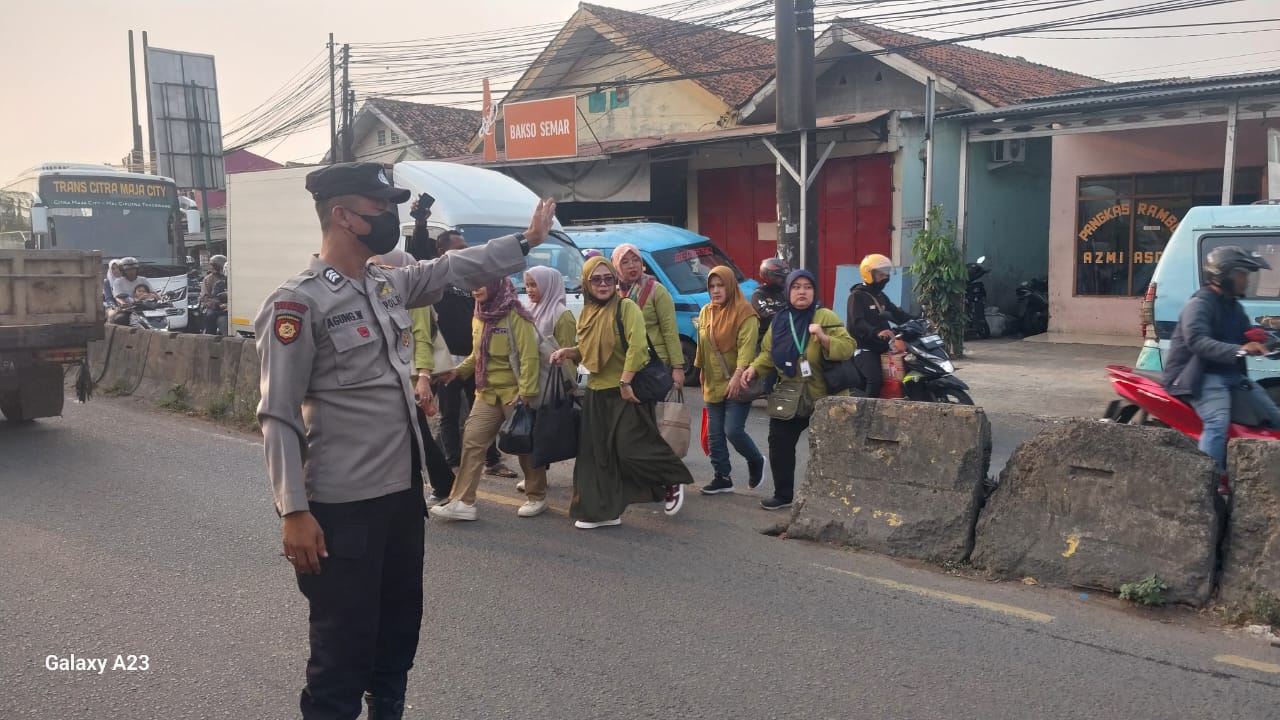 Petugas melakukan pengaturan arus lalu lintas di titik rawan kepadatan, mengingat jam sibuk karyawan keluar dari kawasan industri sekitar. Kehadiran personel polisi di lapangan memberi rasa aman dan nyaman bagi para pengguna jalan.