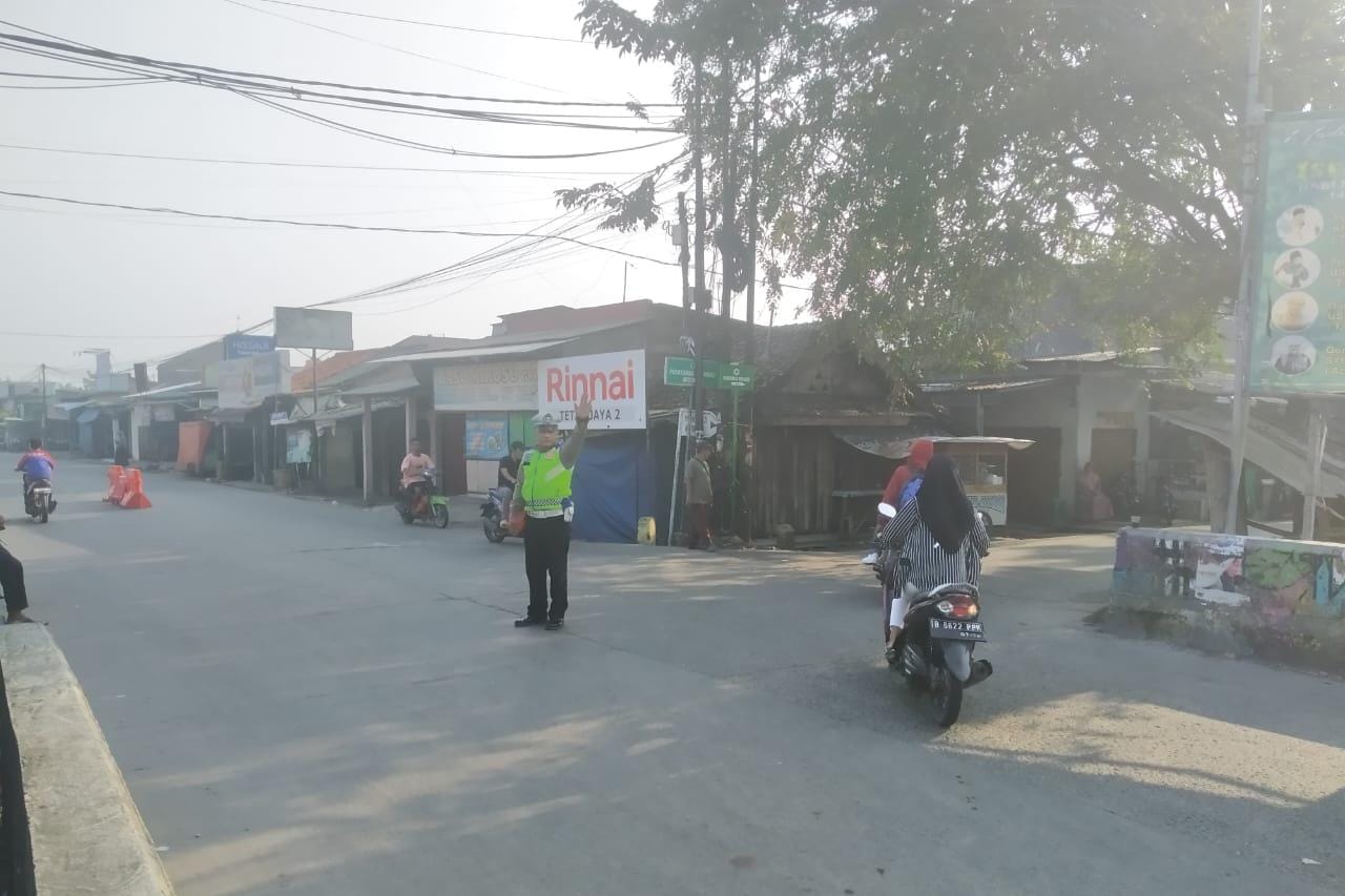 Tangerang– Anggota Lantas Polsek Mauk Polresta Tangerang Polda Banten Aipda Sigit melakukan pengaturan arus lalu lintas pada Sore hari di perempatan pasar jati.