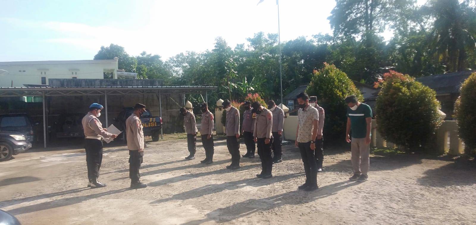 Kegiatan apel pagi adalah kegiatan yang wajib dilaksanakan oleh anggota Kepolisian. Seperti yang terlihat di gambar tersebut bahwa apel pagi dilakukan di depan halaman Polsek sumur Pandeglang.