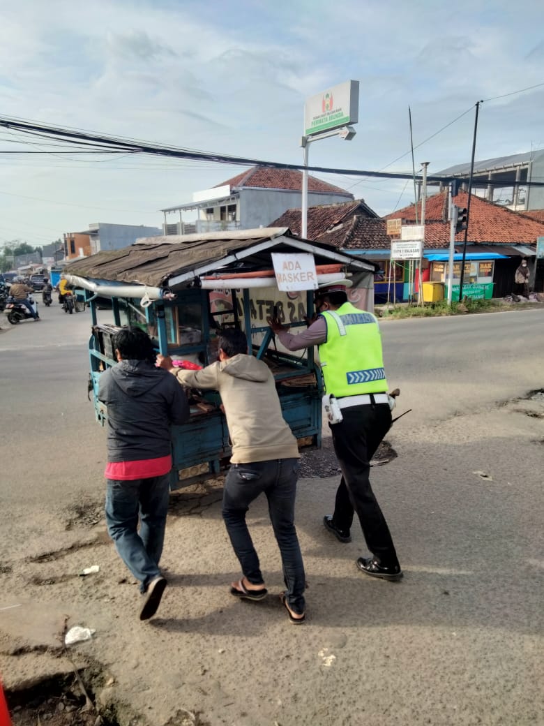 Baraknews Polsek Pandeglang,-Piket pelayanan unit lantas Polsek Pandeglang, Bripka Thomas dan warga sekitar bantu evakuasi kendaraan motor Roda tiga milik warga yang mogok,Sabtu, (12/02/2022)