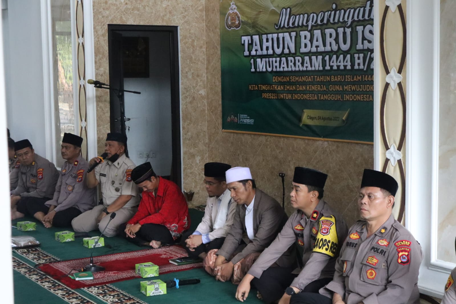 Baraknews polres Cilegon–Polres Cilegon Polda Banten melaksanakan peringatan Tahun Baru Islam 1 Muharram 1444 H/ 2022 M dengan tema Dengan Semangat Tahun Baru Islam 1444 H Tingkatkan Iman dan Kinerja, Guna wujudkan Polri yang Presisi untuk Indonesia Tangguh, Indonesia Tumbuh, yang langsung dipimpin oleh Kapolres Cilegon AKBP Eko Tjahyo Untoro dan didampingi Wakapolres Cilegon Kompol Andie Firmansyah di Masjid Al-Hidayah Polres Cilegon, Kamis, (04/08).
