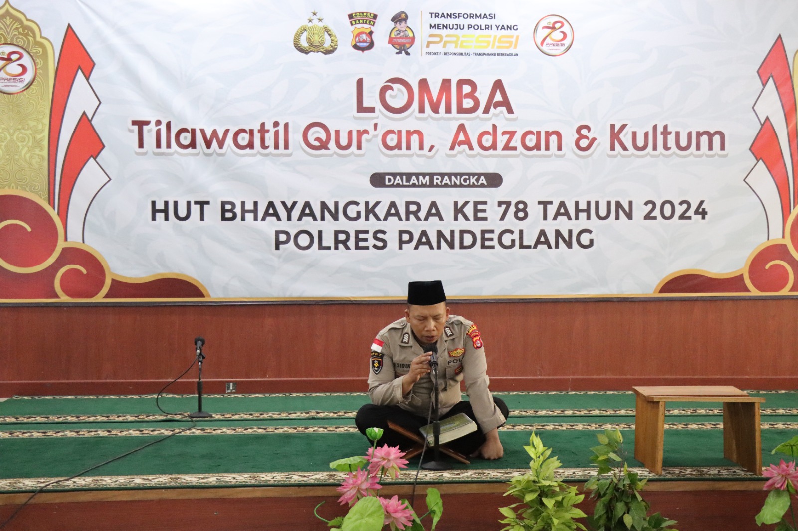 Pandeglang, Banten – Dalam rangka memperingati Hari Ulang Tahun (HUT) Bhayangkara ke-78, Polres Pandeglang mengadakan berbagai kegiatan perlombaan. Salah satu yang menarik perhatian adalah Lomba Tilawatil Quran, Adzan dan Kultum yang diikuti oleh seluruh anggota Bhabinkamtibmas Polsek Jajaran dan Polres Pandeglang.
