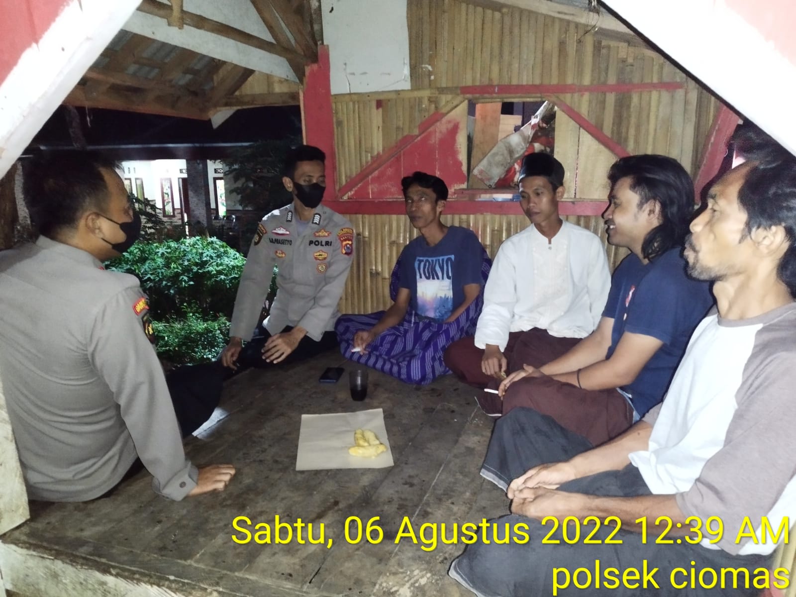 Kanit Binmas Polsek Ciomas Polresta Serkot menyambangi warga yang melaksanakan ronda,kemudian sampaikan pesan kamtibmas.
