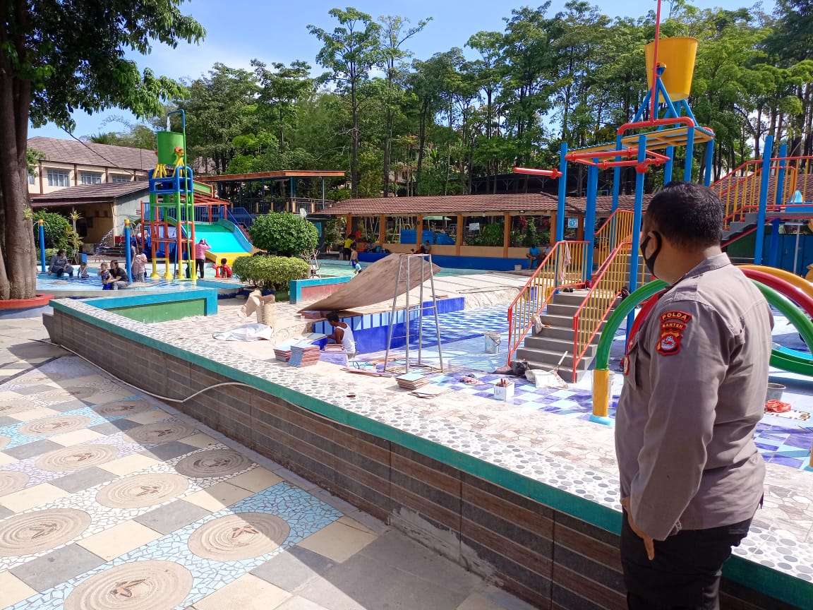 Anggot Polsek Rangkasbitung Polres Lebak rutin patroli dan PAM di tempat wisata air kolam renang di kampung Cimesir, Desa Rangkasbitung Timur , Kecamatan Rangkasbitung, sekalugus berikan himbauan dan edukasi prokes kepada pengunjung di Kolam Renang BIM.