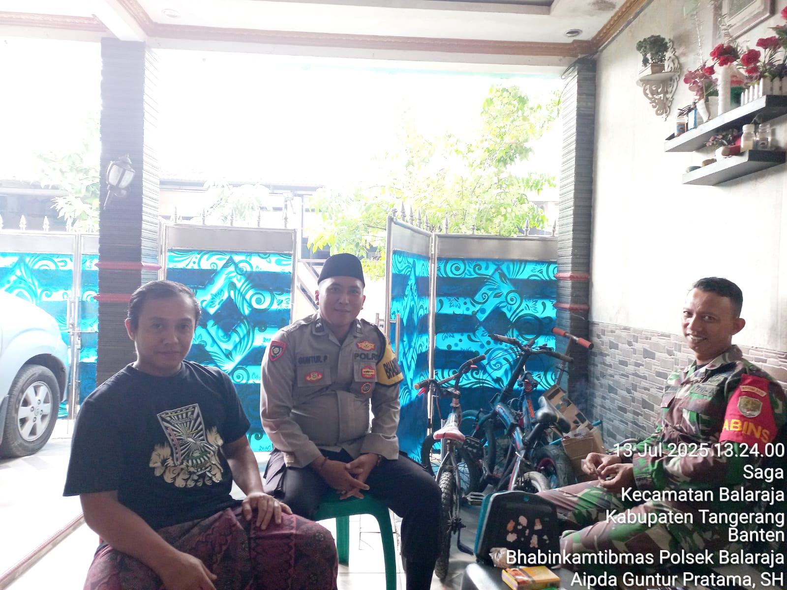 TANGERANG | Bhabinkamtibmas Polsek Balaraja Aipda Guntur P. bersama Babinsa Sertu Dede IK Giat Sambang DDS dan Silaturahmi kepada Bpk Akhfan Elfasakh selaku Tokoh Masyarakat di Perum Salaka Nagara RT 012/02 Desa Saga Kecamatan Balaraja Kab. Tangerang. Minggu (13/07/2025).