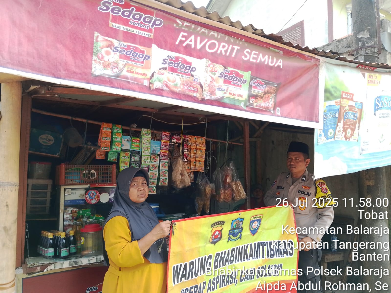 TANGERANG | Personil Bhabinkamtibmas Polsek Balaraja Aipda Abdul Rohman SE melaksanakan giat Sambang warung Bhabinkamtibmas milik Sdr Joleha di Kp Kubang Asem RT 02/01 Desa Kubang Kecamatan Sukamulya Kabupaten Tangerang. Sabtu (26/07/2025).