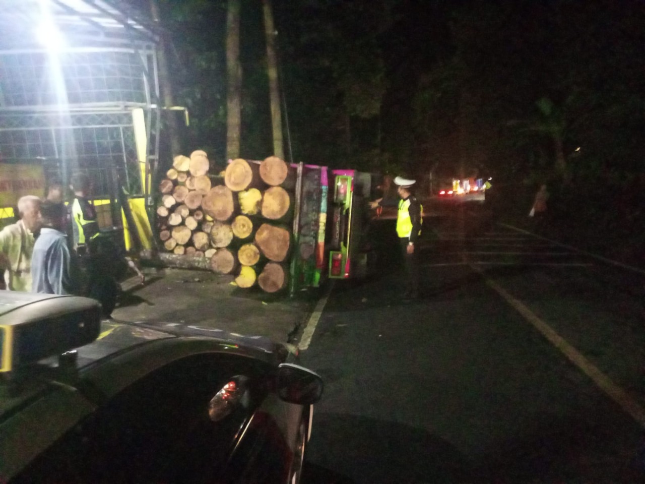Baraknews Polres Pandeglang – Karena kelebihan muatan, truk angkut kayu terguling di jalan Lintas AMD Timur tepatnya di Cimanying, Pandeglang. Sebuah Truk bermuatan kayu mundur dan terguling di sebelah kiri jalan, Sabtu malam (12/03/2022).