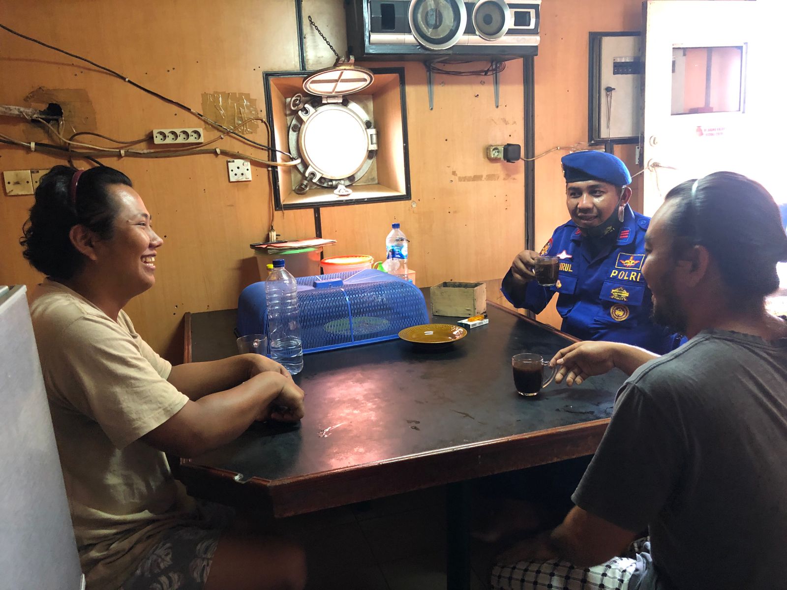 Baraknews Tangerang—Anggota Satpolairud Polresta Tangerang melaksakan Kegiatan Yu Ngopi Wae Bersama Abk Kapal Tugboat. Tangerang, Minggu (13/03/2022).