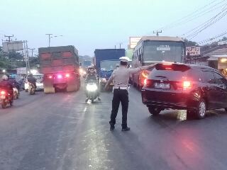 Tampak terlihat kepadatan arus lalulintas di simpang Ambon Kecamatan Cikande Kabupaten Serang, berkat kesigapan polisi situasinya dapat terurai.