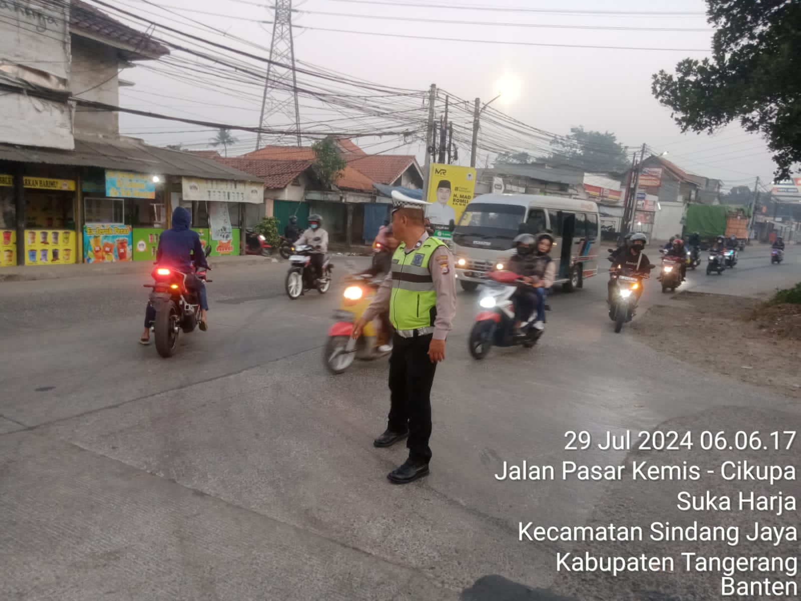 Tangerang – Demi terwujudnya pelayan prima, Personil lalu lintas Polsek Pasar Kemis Polresta Tangerang melakukan pengaturan lalu lintas untuk mengurai kemacetan bertempat di perempatan kebeng Jl. Raya Pasar Kemis-Cikupa kecamatan Pasar Kemis, pada Senin (29/07/2024) pukul 06.30 Wib.