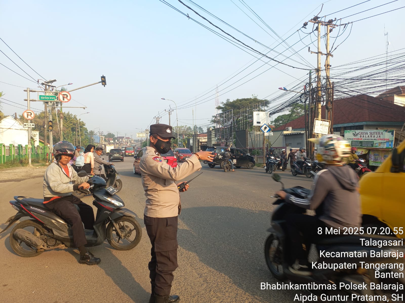 TANGERANG | Personil Aipda Nur Alamsyah dan Aipda Guntur Pratama SH dari Polsek Balaraja melakukan pengaturan lalu lintas Pagi Hari Demi terwujudnya pelayan prima di Wilayah Jalan Raya Serang depan Kecamatan Balaraja/Jembatan Sangereng, di Wilayah Hukum Polsek Balaraja Polresta Tangerang. Kamis (08/05/2025).