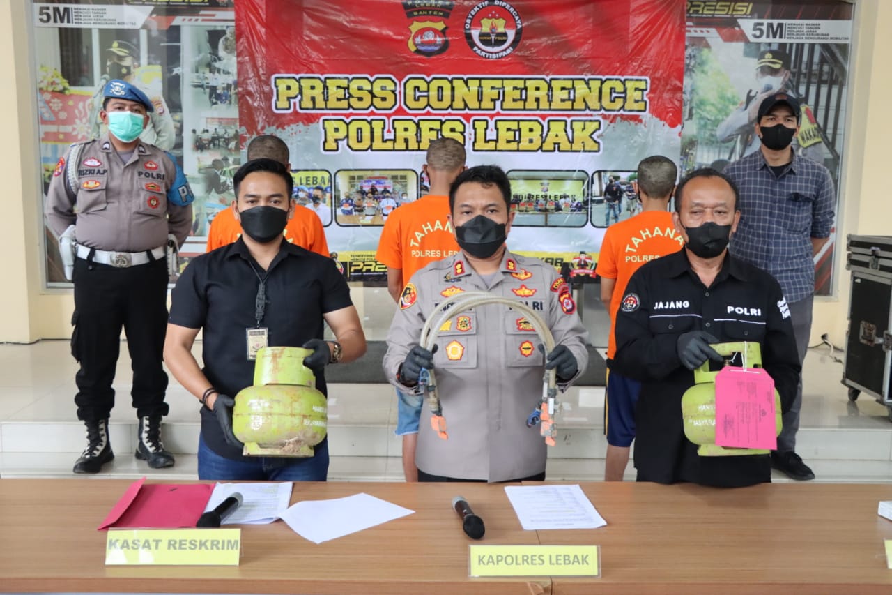 Tiga pelaku DA (19), NK (21), AP(33) berhasil diamankan oleh Jajaran Sat Reskrim Polres Lebak Polda Banten beserta barang bukti 307 (Tiga Ratus Tujuh) buah tabung gas LPG ukuran 3 kg, 5,5 kg, 12 kg dan 50 kg , 48 buah selang regulator, dua unit mobil pick up dan satu unit timbangan digital di Kp. Cokel Desa Lebak asih Kecamatan Curugbitung Kabupaten Lebak pada Rabu (7/9/2022) pukul 02.00 wib.